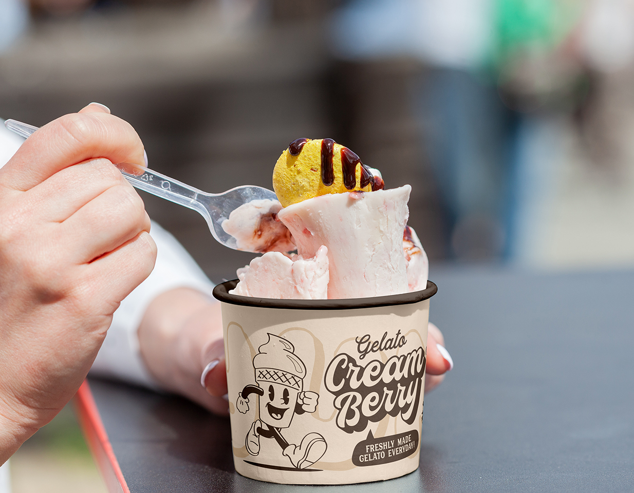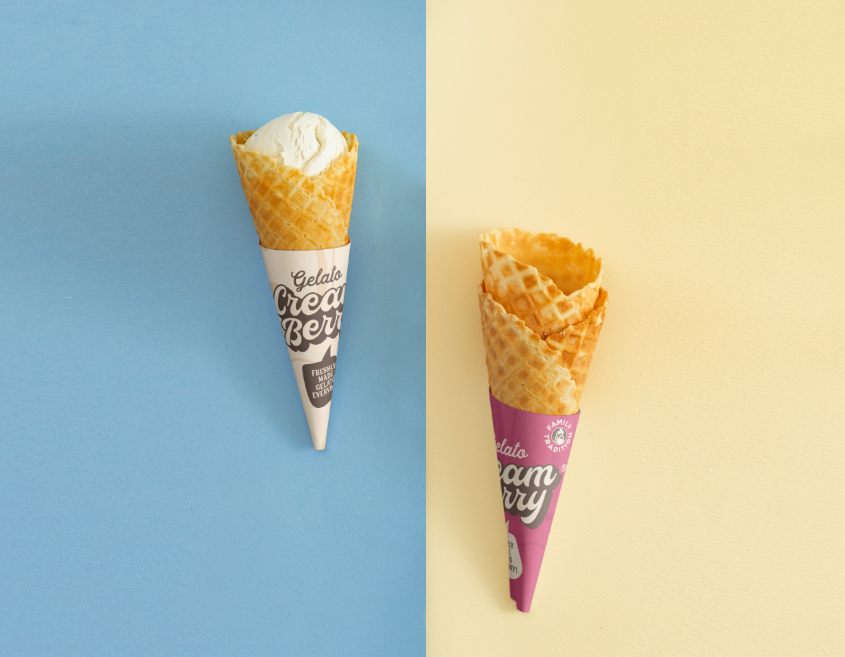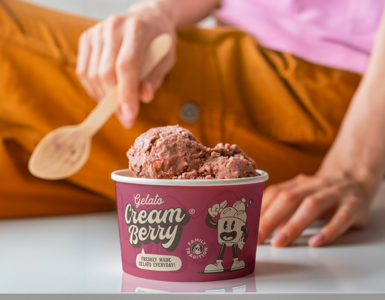 El uso de elementos circulares no es casual. La geometría circular transmite protección, comunidad y, sobre todo, calidez. En el contexto de Cream Berry Gelato®, estas formas evocan la suavidad del gelato recién servido y la perfección de una fruta madura, creando una exclusividad que invita al consumidor a detenerse y disfrutar.