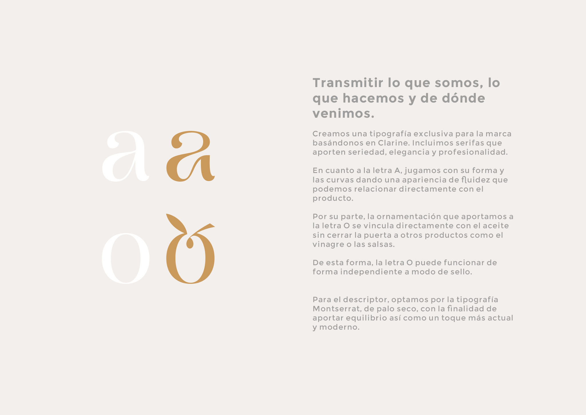 Para lograrlo, se diseñó una tipografía exclusiva basada en Clarine, incorporando serifas que aportaran seriedad, elegancia y profesionalidad. La letra «A» se estilizó con curvas que evocan la fluidez del aceite, mientras que la letra «O» se ornamentó de manera que sugiere el aceite y, potencialmente, otros productos como vinagre o salsas. Esta «O» puede utilizarse como un sello distintivo de la marca.