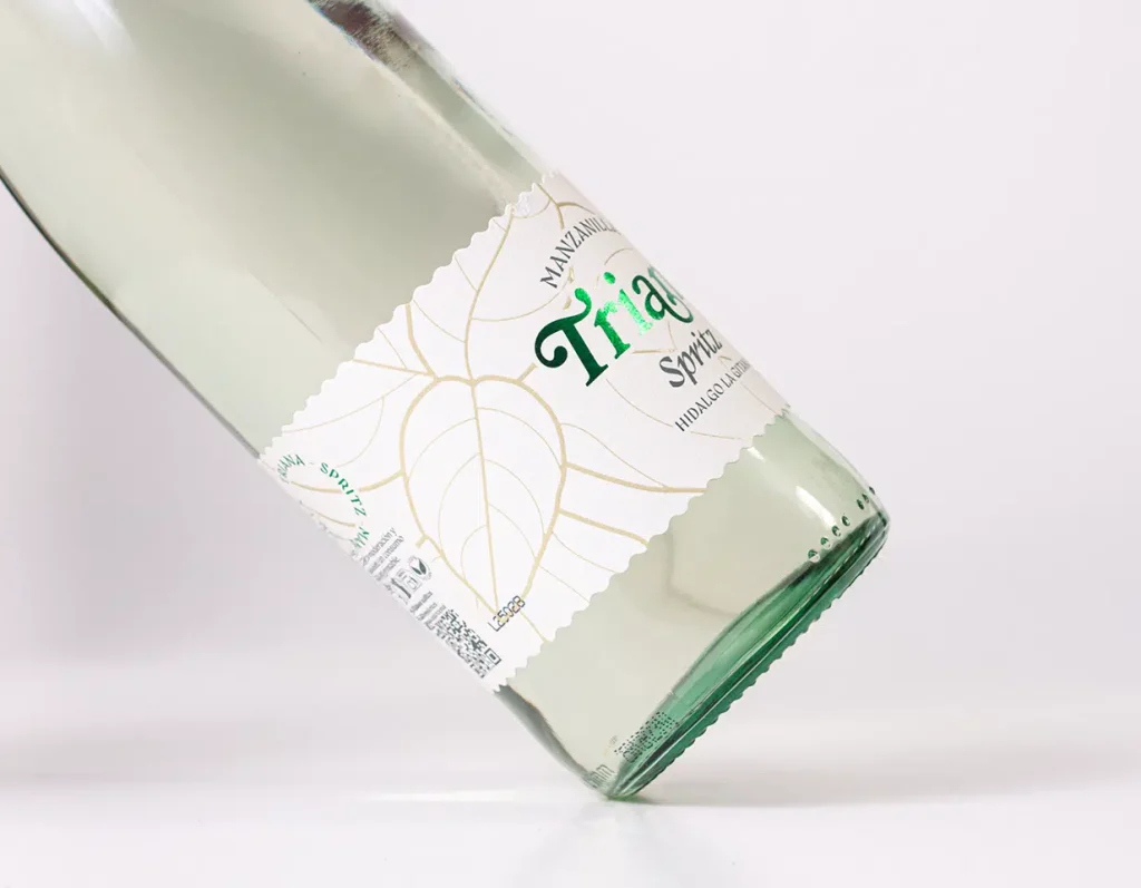 El proyecto «Manzanilla Triana Spritz» nos desafió a capturar la esencia vibrante y refrescante de una bebida tan arraigada en la cultura andaluza como la manzanilla, pero con un giro moderno y efervescente. La clave de este diseño radicó en la representación visual de la hierbabuena, un ingrediente que aporta una frescura distintiva a la bebida. Nos inspiramos en la delicadeza y la complejidad de las venas de las hojas de hierbabuena, que se asemejan a intrincadas huellas dactilares. Este concepto se tradujo en un diseño de etiqueta que no solo es visualmente atractivo, sino que también comunica la autenticidad y la naturalidad del producto.