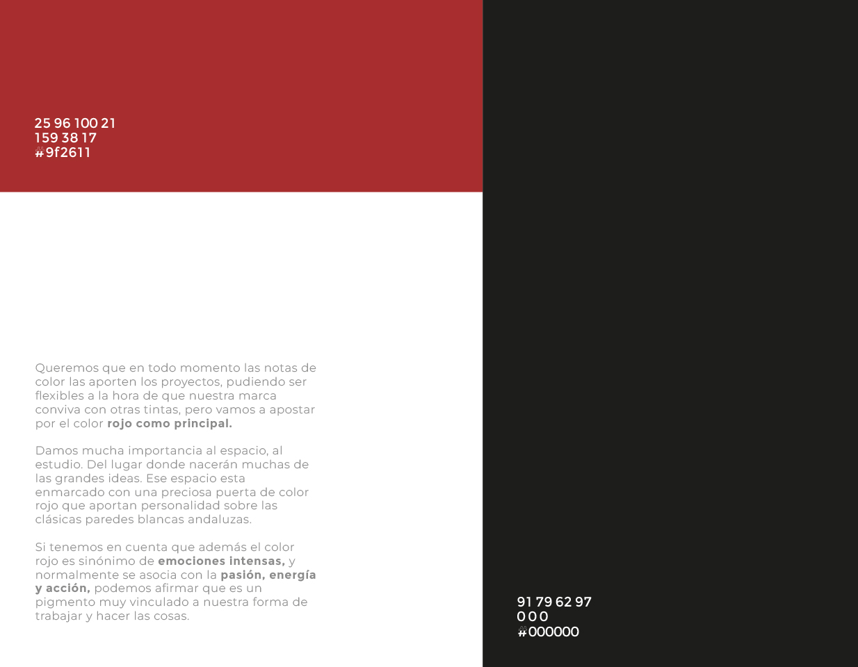 El rojo, símbolo de energía y emoción, es el color principal de la marca, destacando sobre las paredes blancas andaluzas y representando la creatividad del estudio. Este enfoque visual refleja una identidad adaptable y atemporal, donde cada proyecto aporta su propia personalidad.